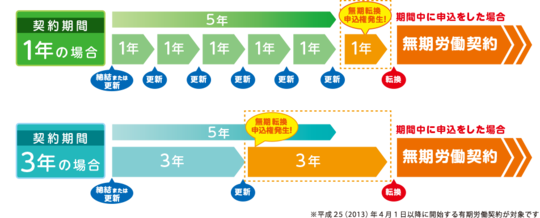 平成25(2013)年4月1日に改正労働契約法が施行され、無期転換ルールにより、有期労働契約が通算5年を超えて反復更新された場合、有期契約労働者の申込みにより、 期間の定めのない労働契約(無期労働契約)に転換されることとなります。